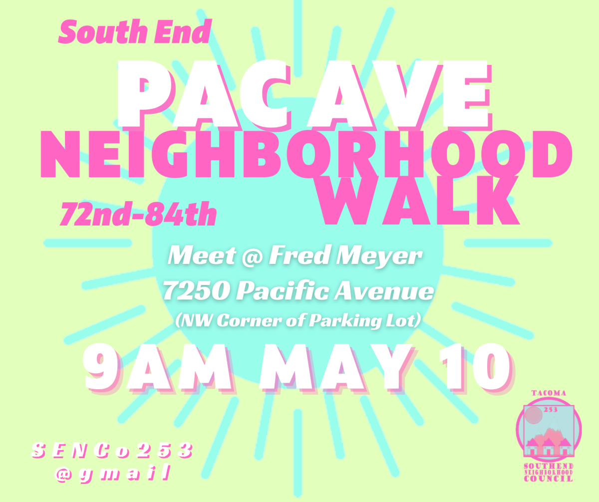 Saturday, May 10th at 9am meet in the NW corner of the Fred Meyer parking lot (7250 Pacific Avenue) where the walk will begin and end.