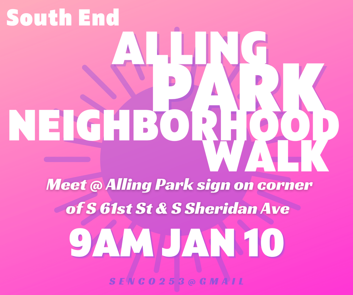 Saturday, January 10th at 9am meet up at the Alling Park sign on the corner of South 61st Street and South Sheridan Avenue where the walk will begin and end.
