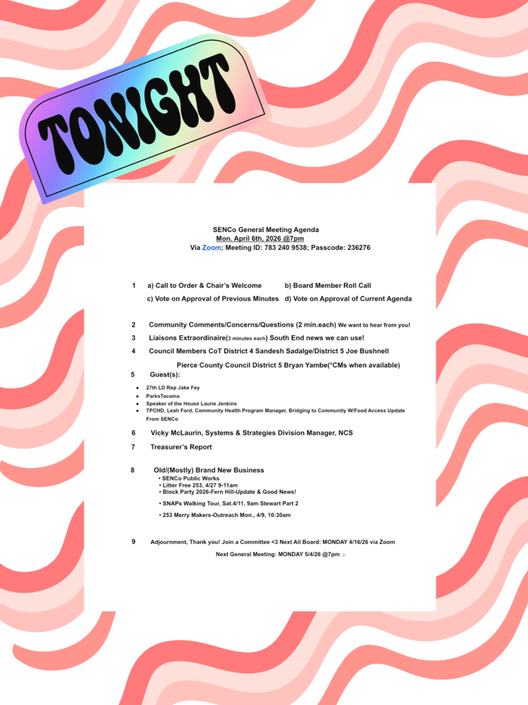 We have a jam packed evening with great information for you! Hear from House Speaker Laurie Jenkins, LD 27’s Jake Fey, and Parks Tacoma sharing out regarding the upcoming bond. As always, lots of opportunities to ask questions or find out how you can get involved or volunteer with any number of our South End, community projects🫶. We are meeting in person at 4911 S Alaska St, Fire Station #8 or via Zoom.