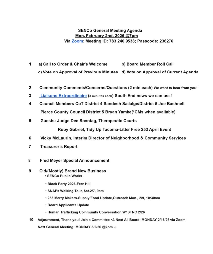We have a jam packed meeting tonight! Please join us for a Fred Meyer update, Special Surprise announcement, presentation on Therapeutic Courts, and a conversation on what’s being done for the immigrant community here in Tacoma.